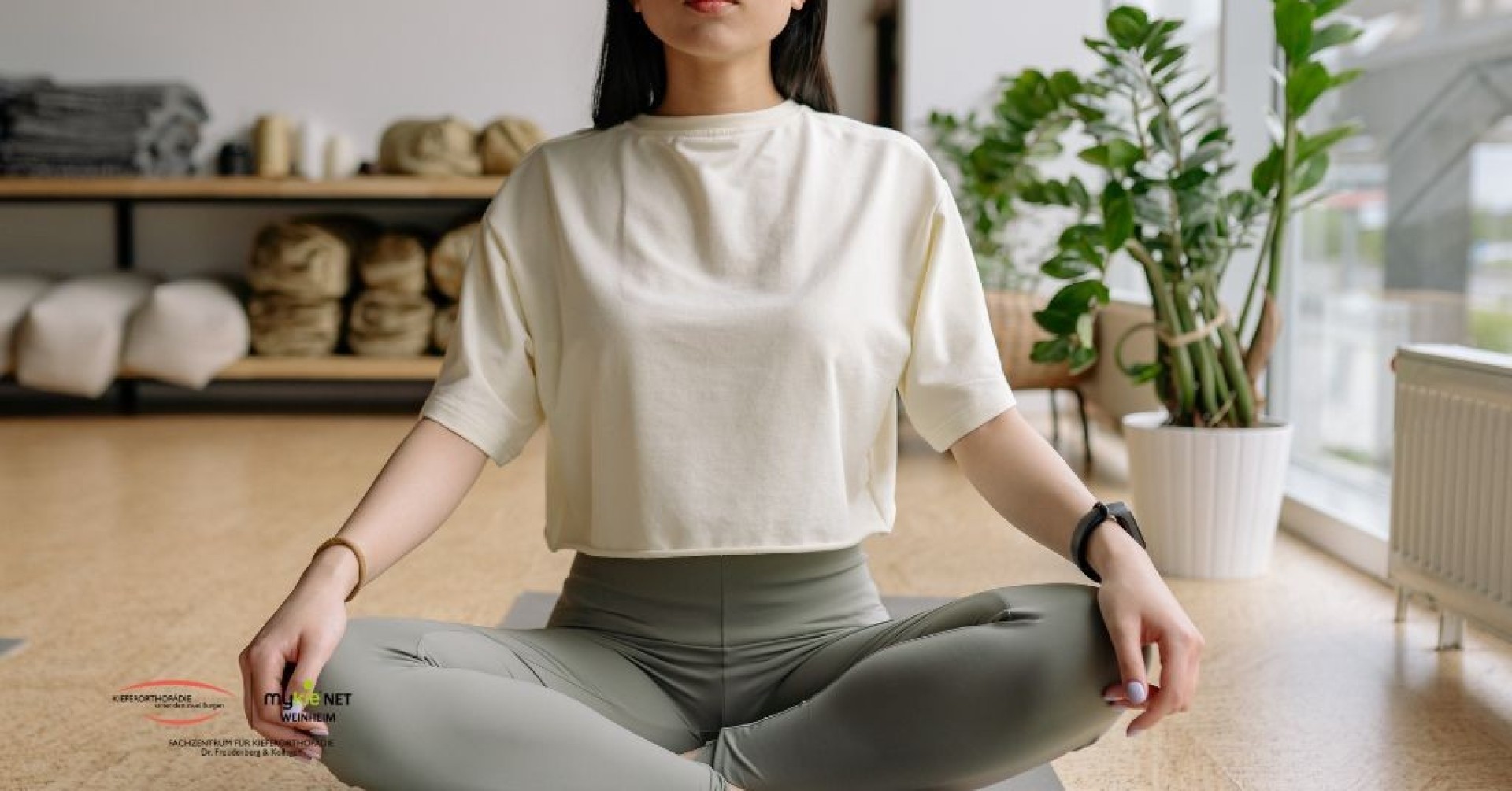 Die Zunge liegt am Gaumen an, während sich Hals und Wirbelsäule sanft verlängern. Die Hände können seitlich an den unteren Rippenkorb gelegt werden, um die Atembewegung bewusst wahrzunehmen.